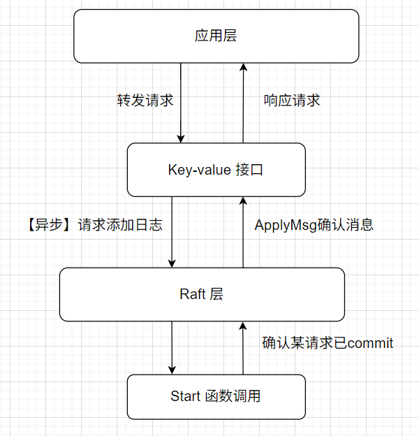 Raft 集群当中主要有两个接口一个是 key-value 接口,另一个是函数调用 Start 接口。key-value 层用来转发客户端请求的接口,Start 函数主要执行日志复制的过程。需要注意的是,key-value 接口向 Raft 层发送请求的时候,并不是同步的,客户端可以不用等待一个请求被确认 commit 之后在发送下一个请求,大量的请求同时发送是常见的。直到 Start 函数执行完毕后,Raft 层通过 applyCh 通道确认 key-value 已经成功执行,可以向客户端返回了。